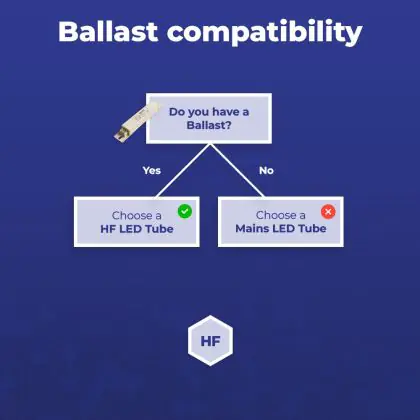 A ballast can be seen as an energy regulator that switches on the lighting. Is there a starter in the fixture? Then this is a conventional ballast (EM). Fixtures with an electronic ballast (HF) don't have a starter. A LED driver can be compared to an electronic ballast and only works with LED lighting.